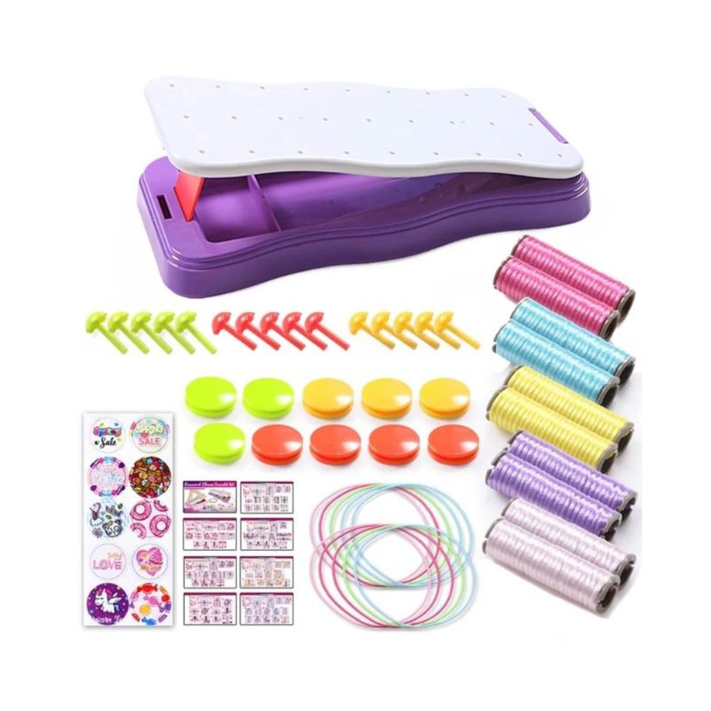 Med et udvalg af farverige reb og flettemaskiner giver dette sæt børn mulighed for at udfolde deres kreativitet og skabe unikke armbånd.