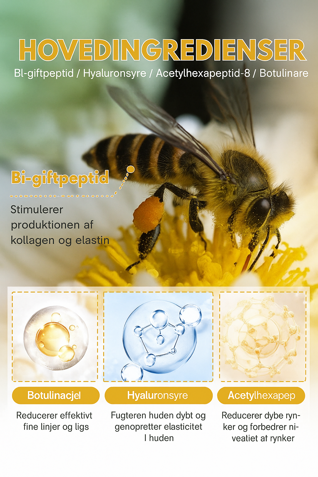 Peptider fra bigift: Bi-gift-peptider efterligner hudens naturlige reaktion på mikrostimulering og stimulerer produktionen af kollagen og elastin. Det kan øjeblikkeligt opstramme og fastgøre huden, mindske hudens synlighed og give en midlertidig løfteeffekt.