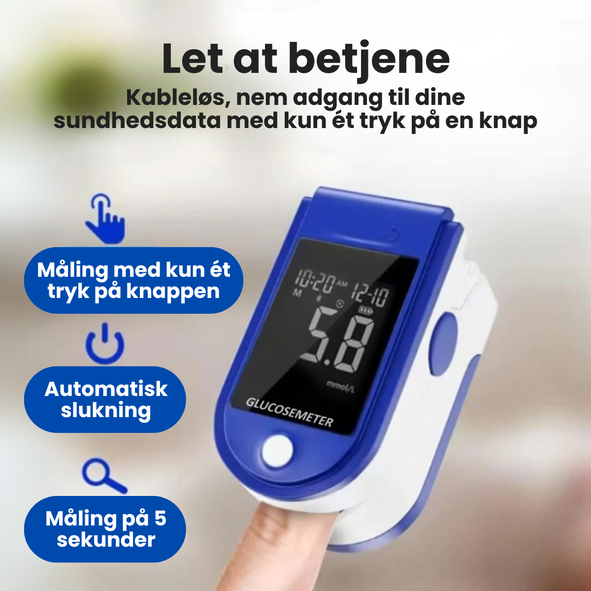 Med GlucoScan™ kan du nemt få en præcis måling på 5 sekunder. Sæt blot enheden på din finger, og du vil modtage dine resultater på få sekunder.