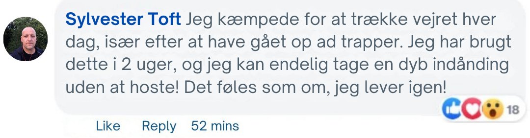Jeg har kæmpet med åndenød i årevis, især på mine morgenvandringer. Jeg blev hurtigt forpustet, og det føltes som om jeg mistede min uafhængighed. Efter at have prøvet dette produkt, mærkede jeg en stor forbedring på bare få dage nu kan jeg gå uden at føle, at jeg kvæles! Det har givet mig en ny følelse af frihed og genoprettet min selvtillid i min daglige rutine. - Malthe R.