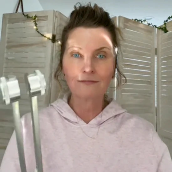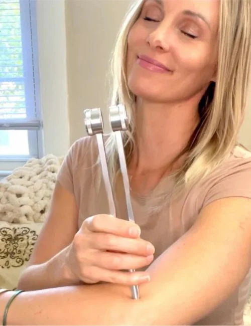 Slå tuning gaffelen med hammeren og placer den på spændte eller ømme områder for direkte lindring. Brug dagligt for bedste resultat.